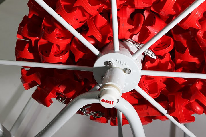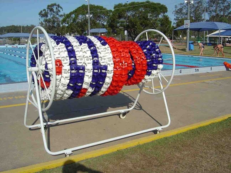 Bęben na liny torowe wykonany z malowanego proszkowo aluminium, koła skrętne, wyśmienity stosunek jakość/cena. Pomieści 6 lin torowych długości 25 m o średnicy krążka 10 cm oraz 2 liny torowe 50 m  o średnicy krążka 15 cm.