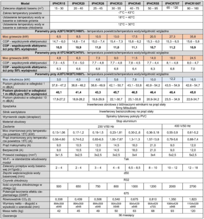 | Zalecana objętość basenu (m3): | 15-30 | 20-40 | 25-45 | 30-55 | 40-75 | 50-95 | 65-120 | 90-160 |