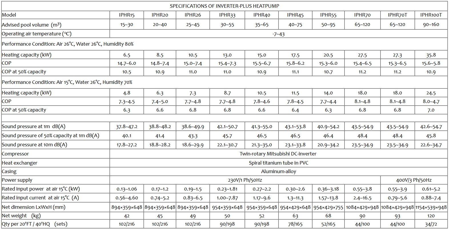 | Model | IPHCR15 | IPHCR20 | IPHCR26 | IPHCR33 | IPHCR45 | IPHCR55 | IPHCR70T | IPHCR100T |