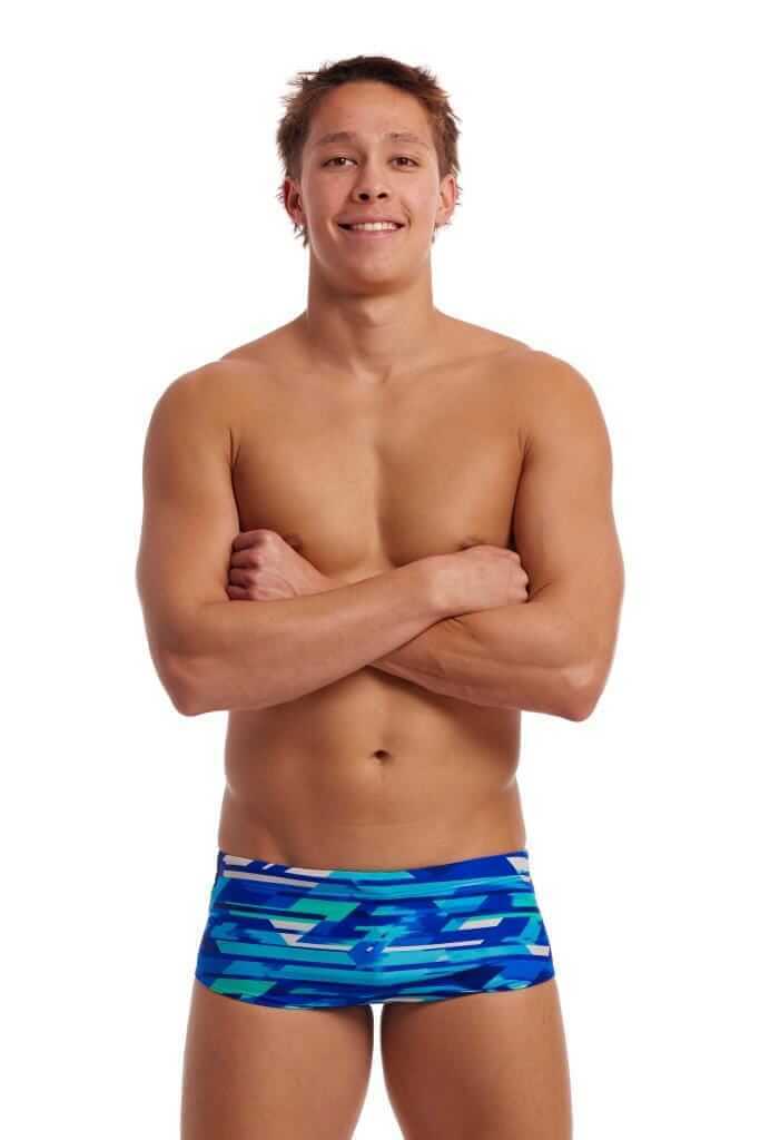 Szorty kąpielowe z najnowszej kolekcji Funky Trunks z odpornym na działanie chloru nadrukiem. Wykonane z trwałej, ekologicznej tkaniny ECO C-Infinity gwarantują wysoką trwałość, a podwójna podszewka znajdująca się w przedniej części zapewnia komfort i swobodę ruchów. Wewnątrz znajduje się sznurek do regulacji w pasie oraz elastyczny pas dla dodatkowego wsparcia. Wszystko to sprawia, że kąpielówki Funky Pace Racer Today sprawdzą się idealnie zarówno w trakcie treningu, jak i pływania rekreacyjnego.