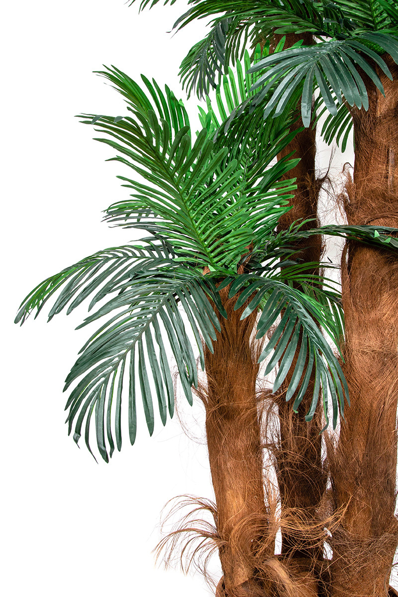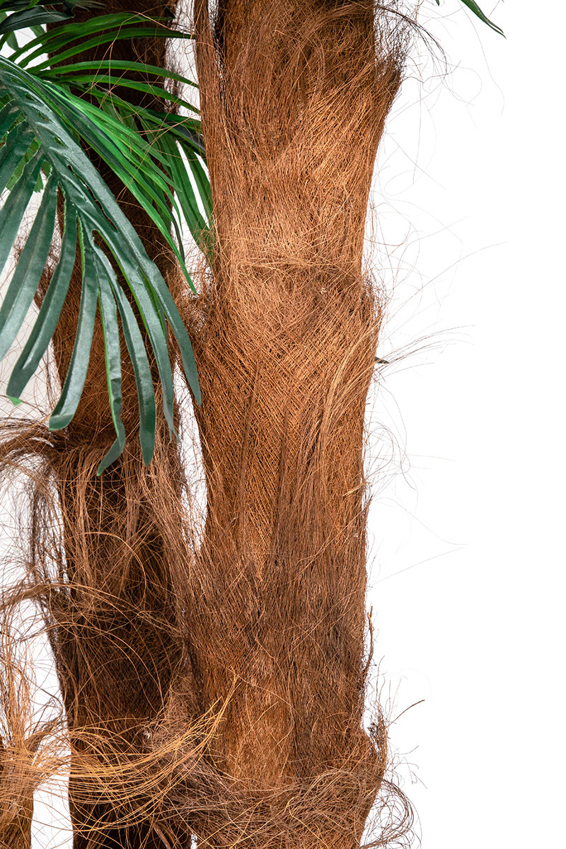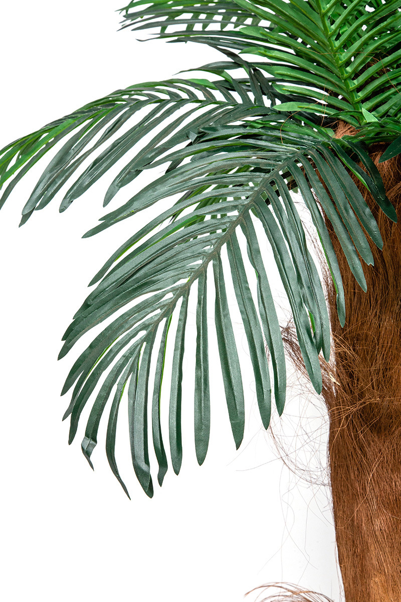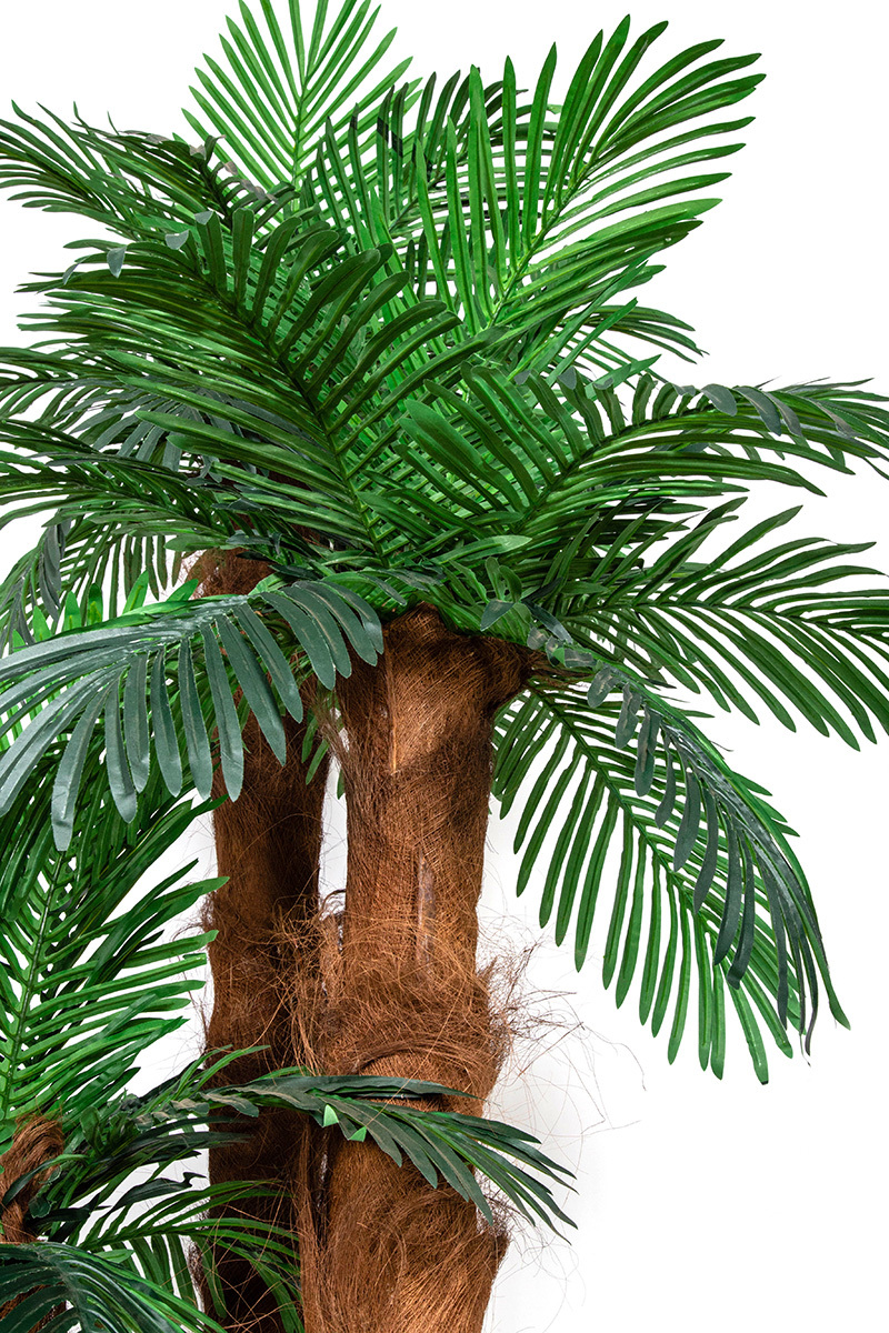 Ta sztuczna palma składa się z 3 pni i kilkudziesięciu doskonale odwzorowanych liści (o długości ok. 50 cm). Pnie palmy otulone są naturalną korą palmową i osadzone są w estetycznej, stabilnej donicy palmy wykonany jest z naturalnej kory palmowej. W zestawie znajduje się również nietuzinkowa ręcznie zdobiona donica. Wysokość całkowita to 210 cm. Palma stwarza niepowtarzalny, egzotyczny klimat. Jest solidnie wykonana z dbałością o każdy detal.