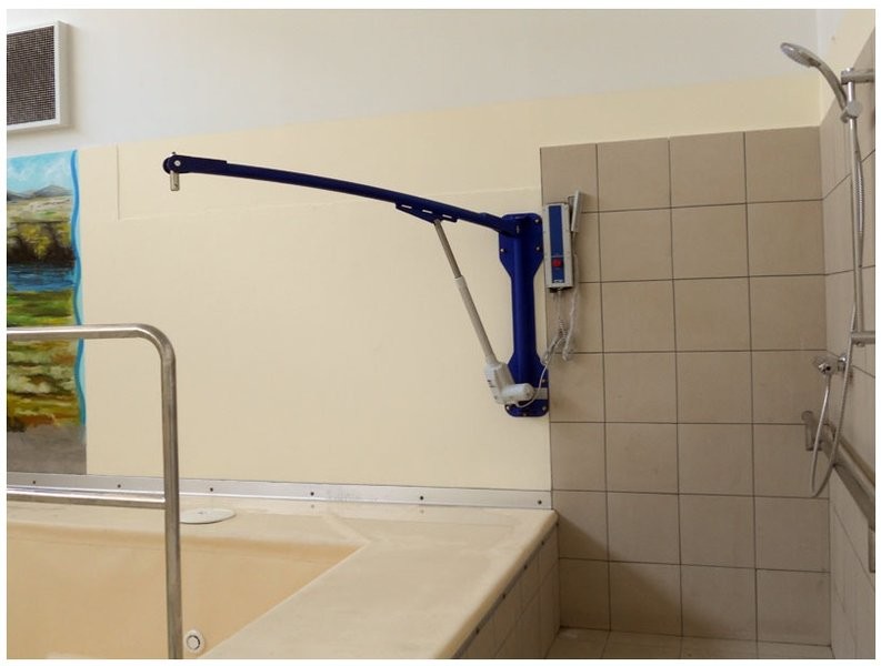 Podnośnik może być wyposażony w niezależne ruchome siedzenie lub szelki. Całość wykonana ze stali ocynkowanej malowanej proszkowo.