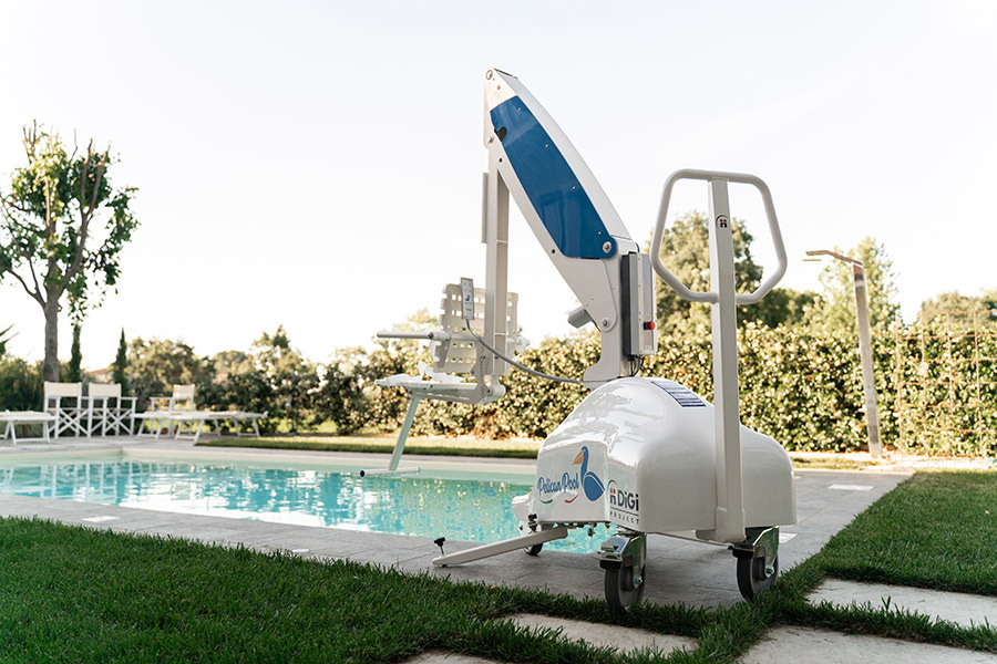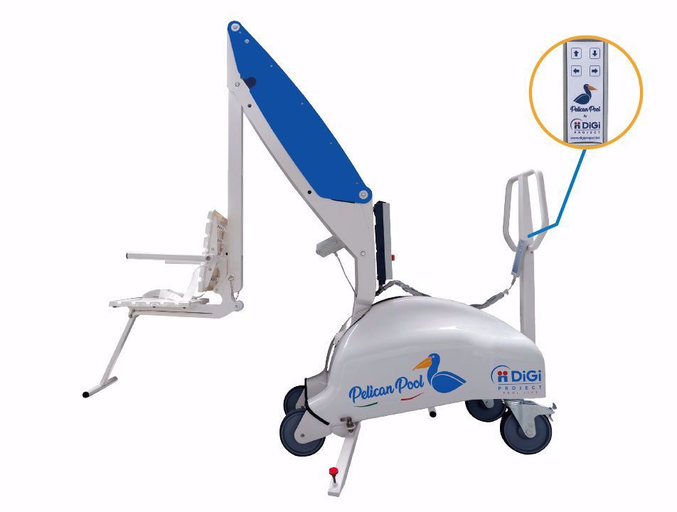 PELICAN POOL to najnowszy model włoskiego producenta firmy DiGiProject gwarantujący osobom ograniczonej sprawności ruchowej ułatwiony dostęp do basenu. Zaawansowana technicznie budowa podnośnika pozwala na likwidację bariery architektonicznej w postaci murku przy krawędzi basenu o maksymalnej wysokości 50 cm. Ponadto, dzięki praktycznemu systemowi obracania siedziska, użytkownik może w pełni samodzielnie wykonywać operacje wchodzenia i wychodzenia możliwy obrót ramienia o 90 stopni w prawo lub lewo. Proces obrotu oraz podnoszenia i opuszczania siedziska odbywa się z pozycji osoby znajdującej się na fotelu podnośnika i sterowane jest za pośrednictwem pilota.