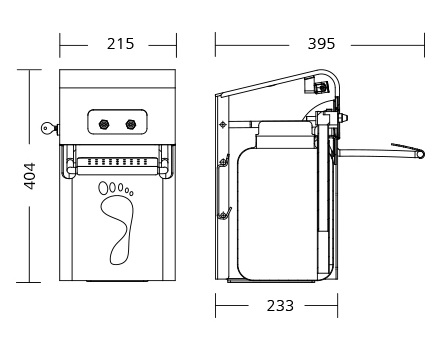 Urządzenie dozujące do preparatów stosowanych w profilaktyce przeciwgrzybiczej stóp oraz do dezynfekcji obuwia. Działa na zasadzie natrysku preparatu dezynfekcyjnego w postaci aerozolu. Urządzenie natryskowe pracuje w oparciu o sprawdzoną w praktyce pompę dozującą ze stali chromowo- niklowej z dwiema dyszami natryskowymi. Umiejscowienie dysz wykonane jest w taki sposób, że możliwe jest całkowite pokrycie środkiem dezynfekcyjnym górnej oraz dolnej części stopy/obuwia. Obudowa wykonana z aluminium. Mieści do 7,5 litra preparatu dezynfekującego.