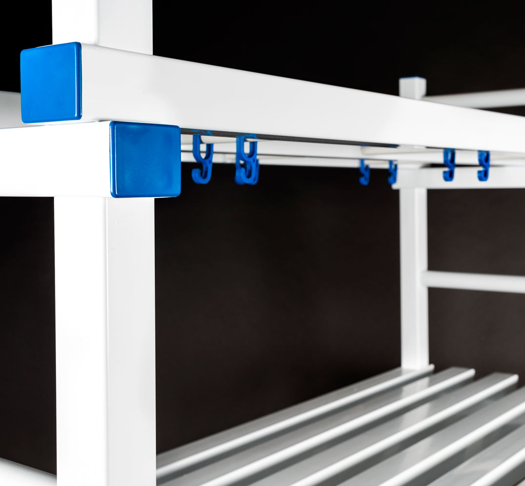 Wózek na sprzęt basenowy z wieszakami. Wykonany w całości z tworzywa sztucznego o gładkiej powierzchni, co zapewnia pełną ochronę przed rdzą oraz gniciem. Zaokrąglone krawędzie zapobiegają wypadkom oraz uszkodzeniu sprzętu. Dostępny w 3 kolorach profili i zakończeń widocznych na zdjęciu.