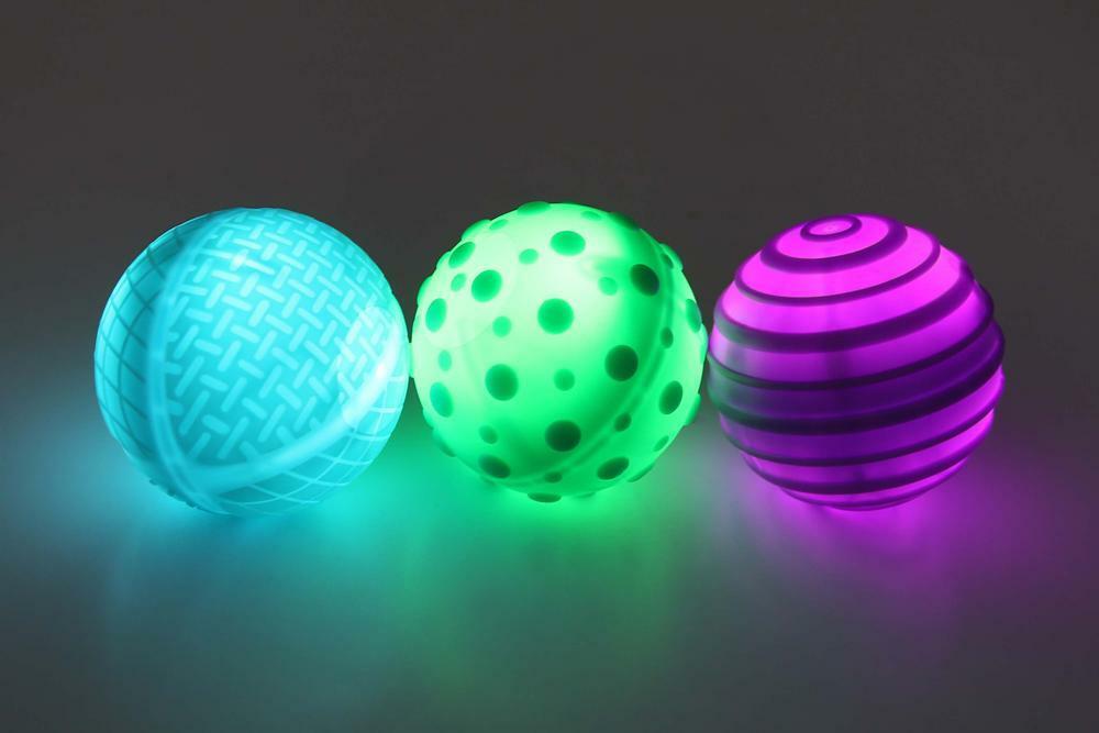 Zestaw 6 piłek (po 2 z każdego rodzaju) różniących się między sobą kształtem powierzchni - każda para posiada inny wzór sensoryczny, co gwarantuje stymulację zmysłu dotyku w trakcie zabawy i pozwala na wykorzystanie zestawu podczas ćwiczeń rozpoznawania kształtów. Dodatkowo, stuknięcie w piłki sprawia, że świecą się one kolorowym, przyjemnym dla oka światłem przez 60 sekund, co zwiększa atrakcyjność produktu i sprawia, że dzieci jeszcze chętniej z niego korzystają. Ładowanie piłek odbywa się przez dołączony przewód USB - 3-4 godziny ładowania pozwalają na korzystanie z zestawu przez 4-5 godzin. Zabawka sensoryczna Świecące piłki to produkt bardzo uniwersalny, który dzięki swoim właściwościom znajdzie zastosowanie zarówno w warunkach domowych, jak i placówkach edukacyjnych, rehabilitacyjnych, salach sensorycznych czy salach zabaw.